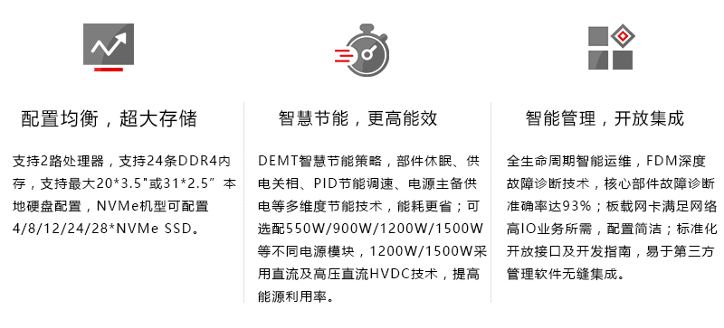 iBMC支持Redfish、SNMP、IPMI2.0等标准接口;提供基于HTML5/VNC KVM的远程管理界面;支持免CD部署和Agentless特性简 化管理复杂度